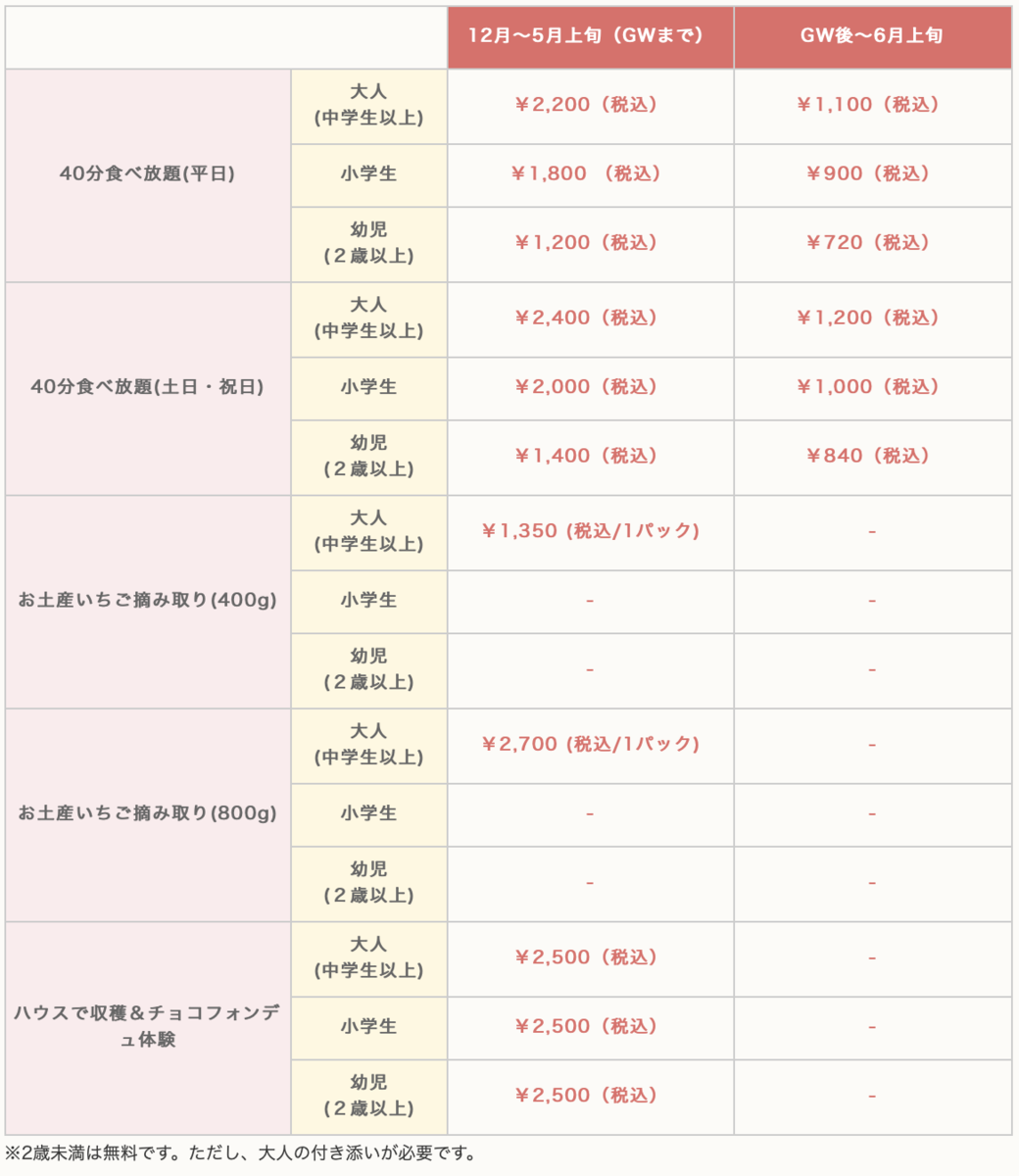 食べ放題(40分)・持ち帰りなど体験できます。いちごのみの販売はないそうです。